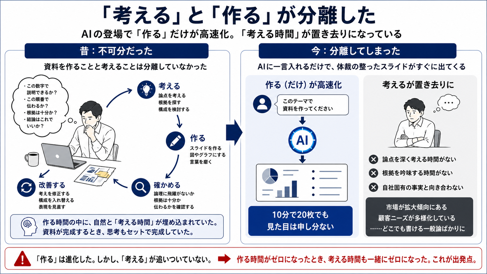 見落とされがちなのは、「考える時間」が意識的に確保されていたわけではなかったということです。「作る時間」の中に自然と埋め込まれていた。3時間かけてスライドを作るから、その間に否応なく考えていた。AIはその強制力ごと取り除いてしまいました。