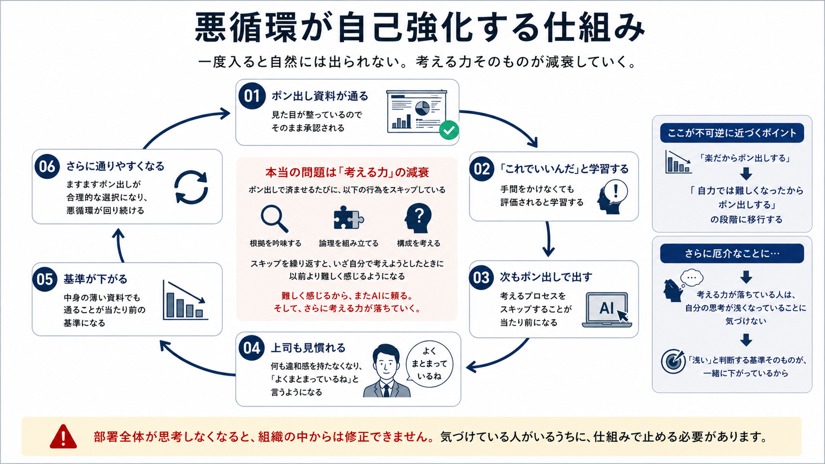 ポン出し資料が通る → 「これでいいんだ」と学習する → 次もポン出しで出す → 上司も見慣れる → 基準が下がる → さらに通りやすくなる。