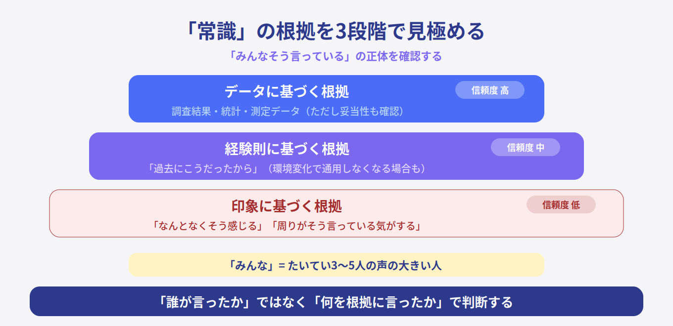 - 「常識」の根拠がデータか、経験則か、印象かで信頼度が大きく変わる