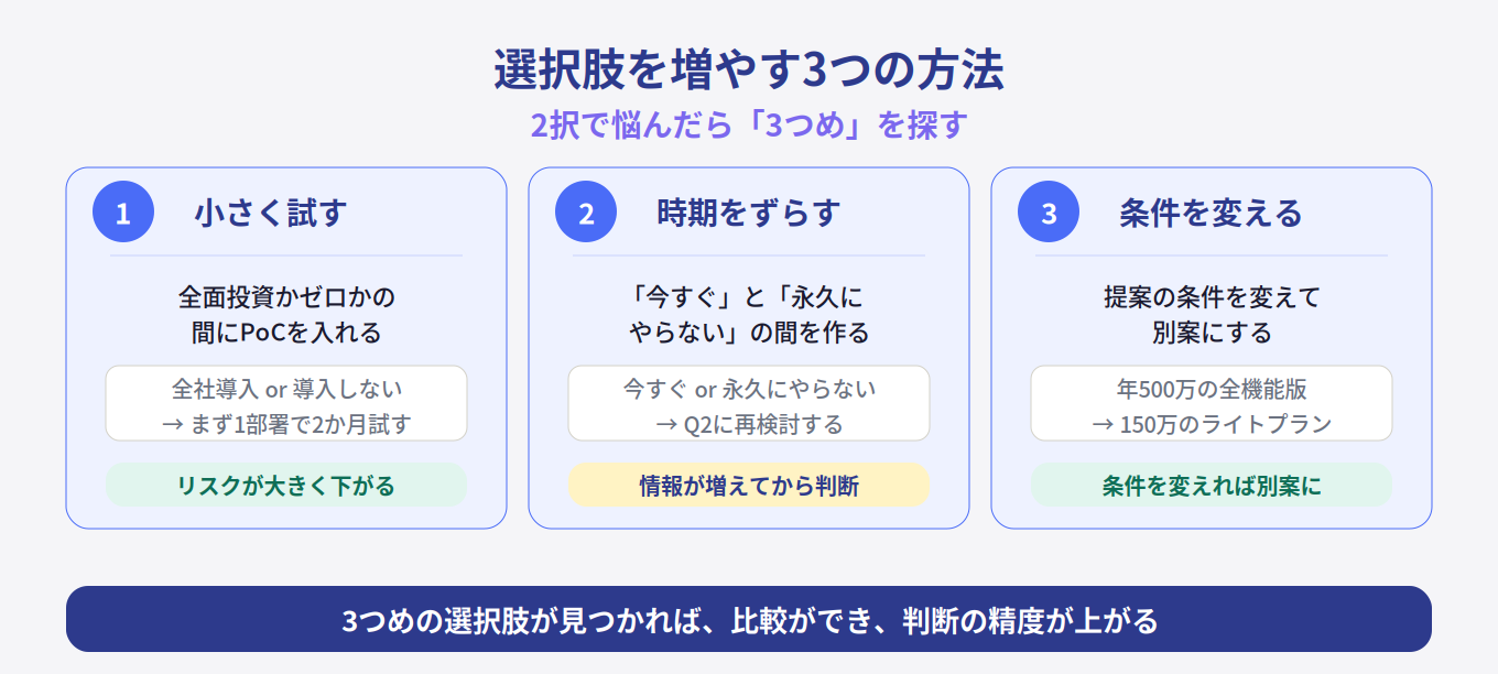 たとえば「新しいAIツールを年間500万円で導入するか」と問われたとき。「500万円の全機能版」と「やらない」の2択ではなく、「150万円のライトプランで1チームだけ導入」という3つめが見えてくる。