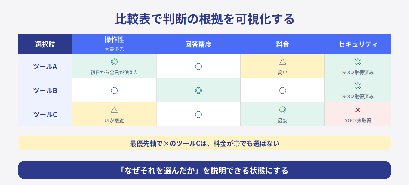 比較表は「正解を見つけるツール」ではありません。「判断の根拠を可視化するツール」です。判断した後に「なぜそれを選んだのか」を説明できる状態にする。ここが重要です。