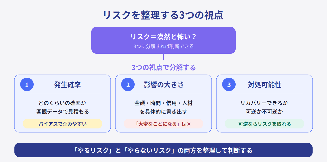 リスクと聞くと漠然と怖く感じますが、3つの視点で分解すると判断しやすくなります。