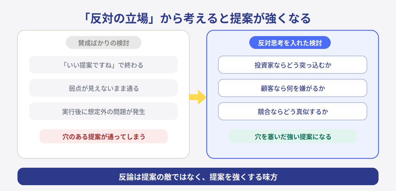 意図的に反対の立場に立つことで、提案の穴が見え、提案が強くなります。