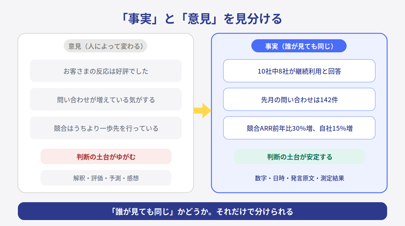 事実とは、数字、日時、発言の原文、測定結果など、誰が見ても同じもの。「10社中8社が継続と回答した」は事実です。「先月の問い合わせは142件だった」も事実です。