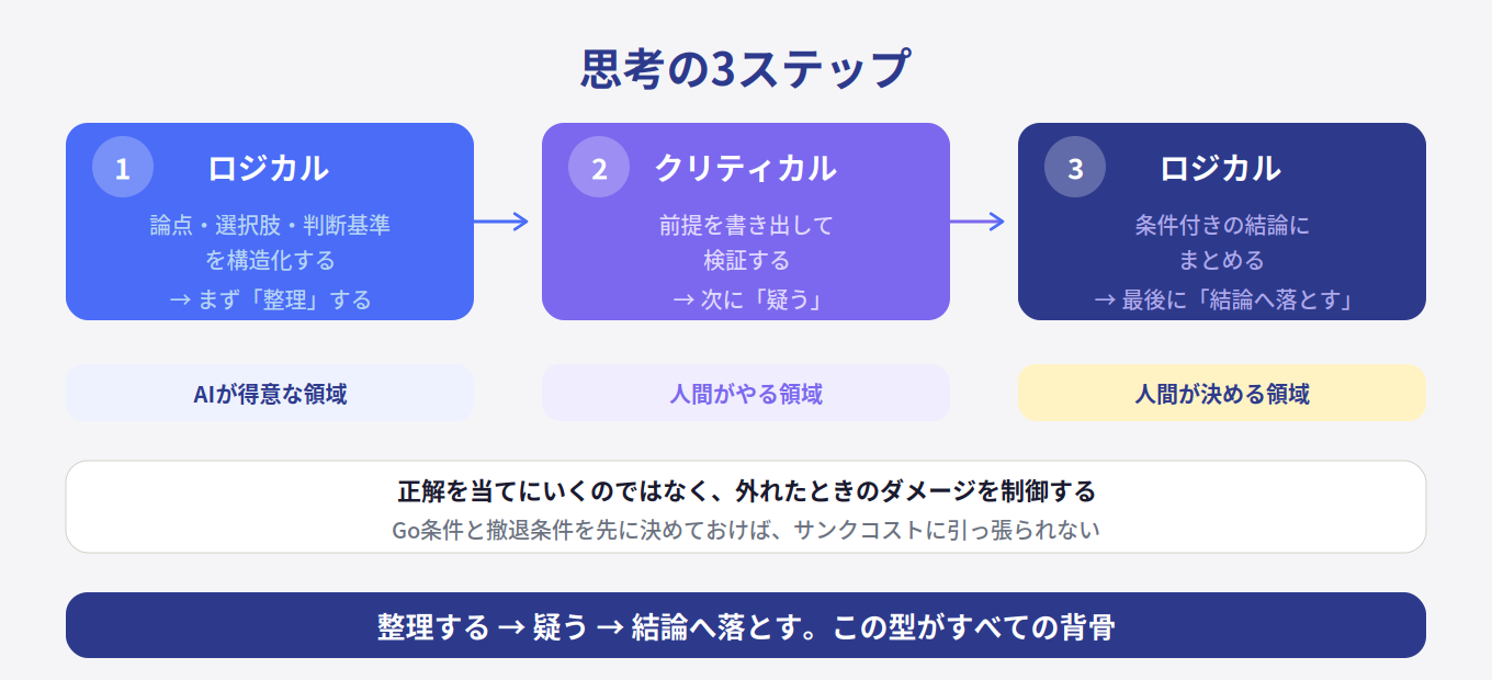 まずロジカルに整理する。次にクリティカルに疑う。最後にロジカルに結論へ落とす。この型を持っておくだけで、どんな判断場面でも使えます。