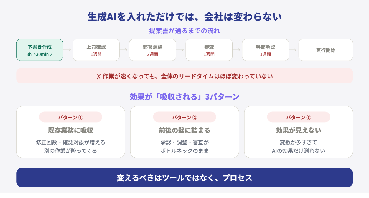 生成AIの導入は、業務プロセス全体を見直す入口です。ツールを入れるだけでなく、ツールが速くした部分の前後を含めたプロセス全体を最適化する必要がある。