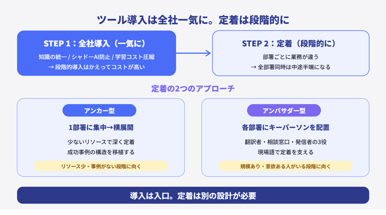 たとえば、最初はアンカー型で1〜2部署に集中する。そこで成果と型ができたら、各部署にアンバサダーを置いて横展開する。この「アンカー→アンバサダー」の流れは段階的に広げるときにかなり自然です。