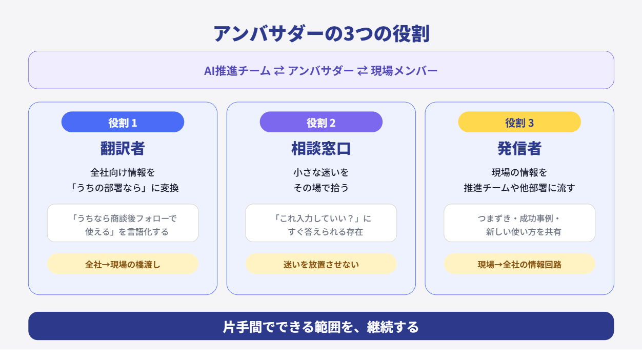 アンバサダーがやるのは、この翻訳です。全社向けの情報を受け取って、「うちの部署なら、この業務のこのタイミングで使える」を言語化する。この一言があるだけで、周囲の人は動きやすくなります。