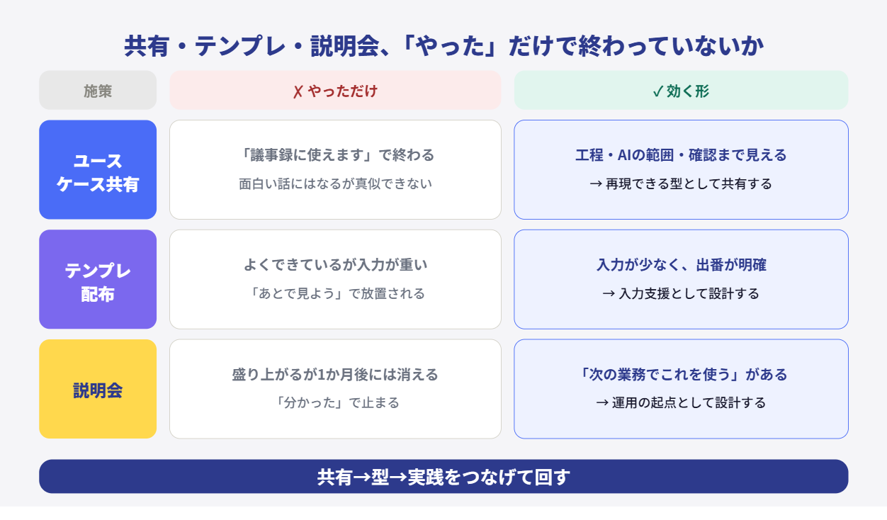 逆に、この3つが機能する会社は「届けた後」を設計しています。共有したユースケースをテンプレートに変える。テンプレートを説明会で実際に触らせる。説明会のあとに「次の業務でこれを使う」を具体的に決める。