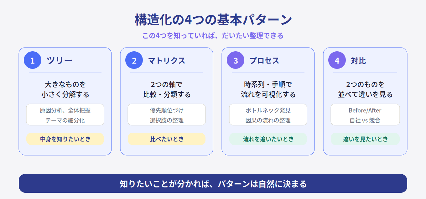 構造化には4つの基本パターンがあり、場面に応じて使い分けることで情報を整理できます。