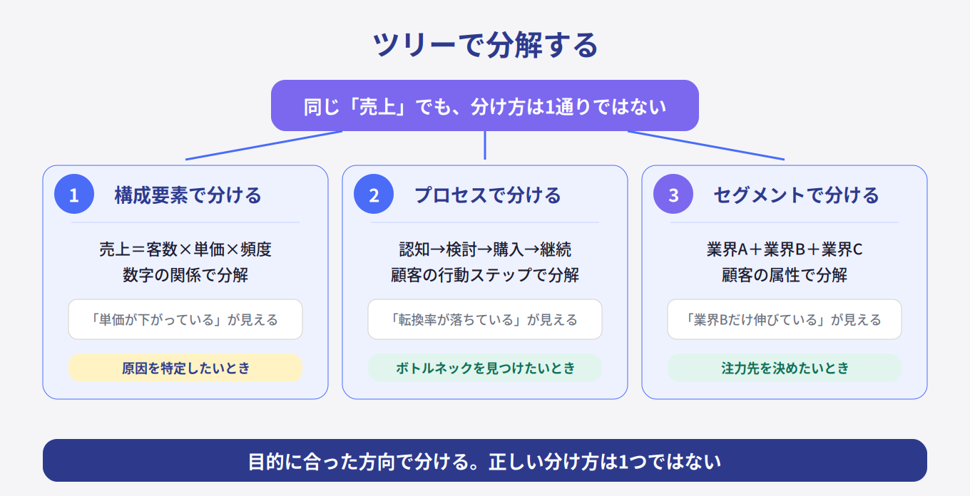 どの方向で分けるかによって、見えるものが変わります。構成要素で分ければ「単価が下がっている」と分かる。プロセスで分ければ「検討から購入への転換率が落ちている」と分かる。セグメントで分ければ「業界Bだけ伸びている」と分かる。