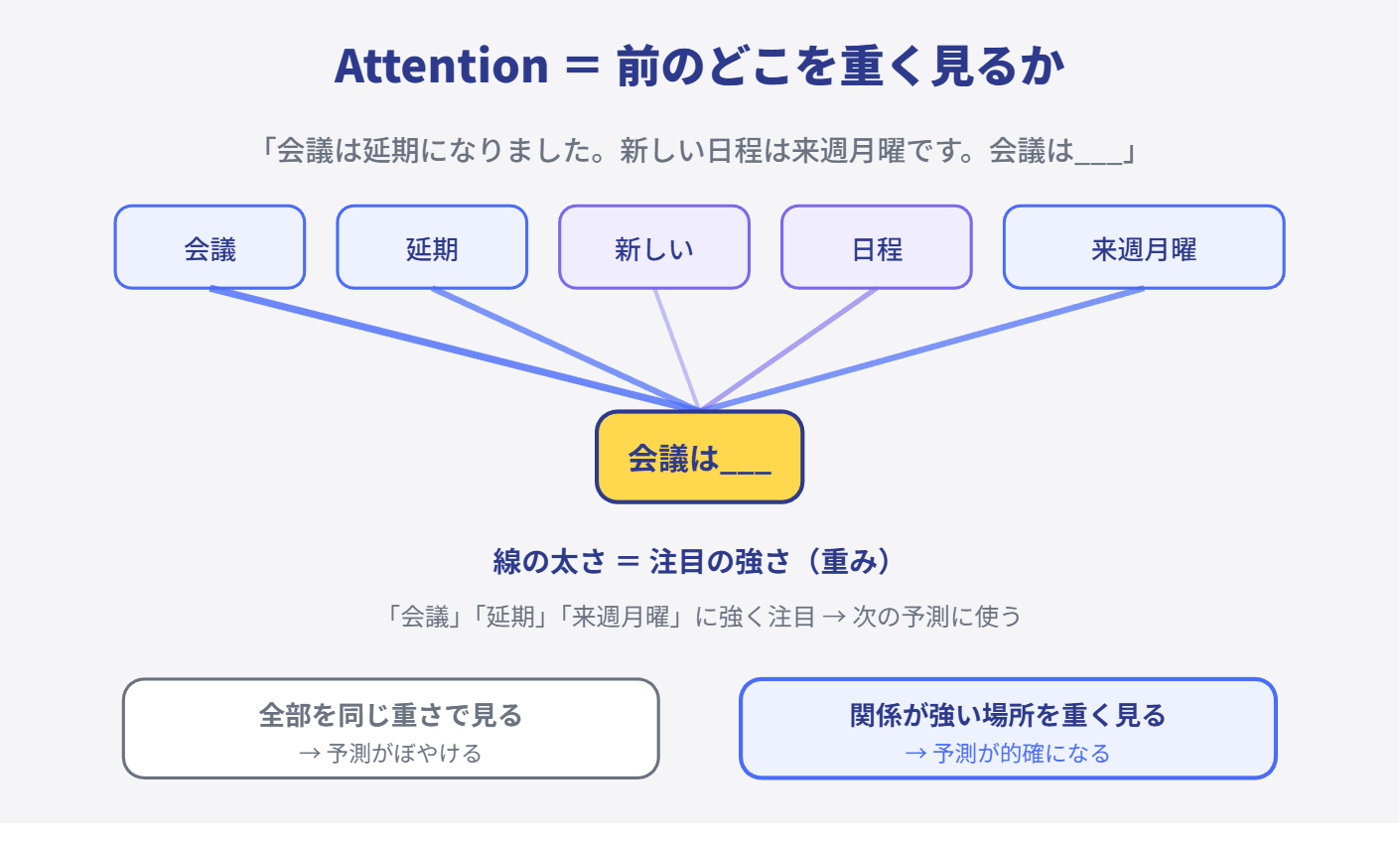 このあとに「会議は___」という続きが来たら、AIは直前の「は」や「です」だけを見ても意味がありません。大事なのは、「会議」「延期」「新しい日程」「来週月曜」のように、前に出てきた重要な部分です。