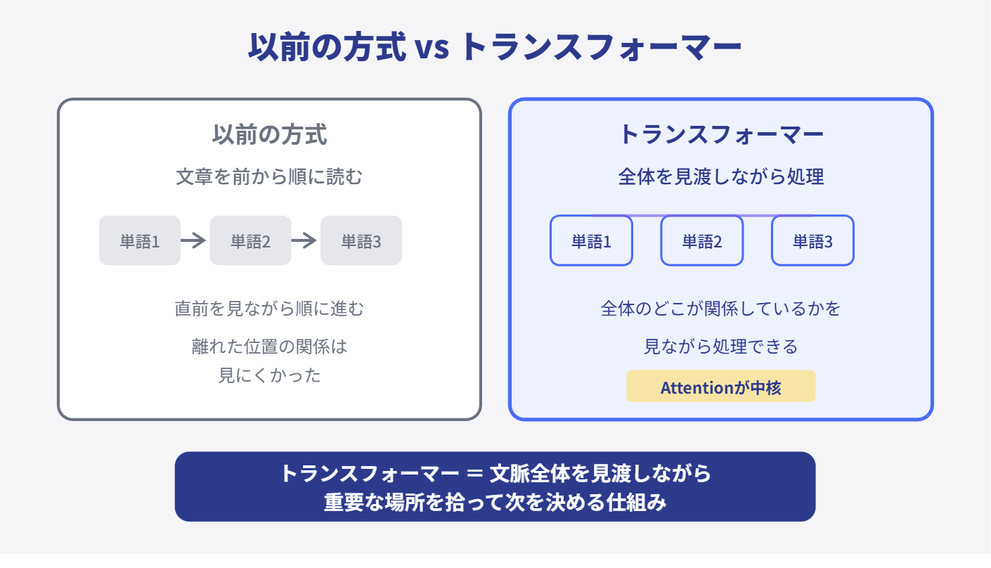 | 長い文脈への強さ | 離れた位置の関係も拾いやすい | 距離が離れると影響が薄れやすい |