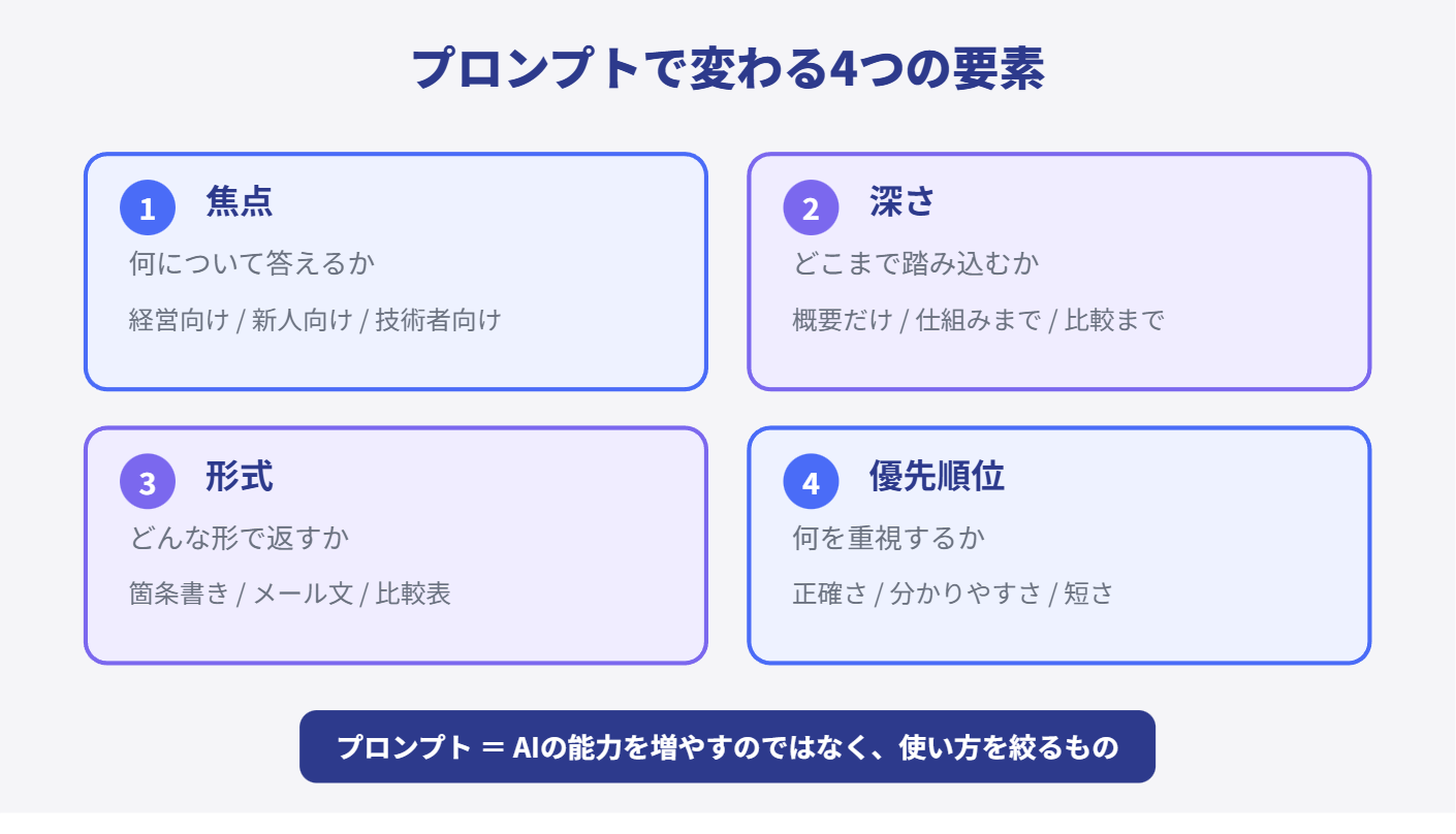 プロンプトを入れると何が変わるのか。シンプルに整理すると、次の4つの軸で変わります。