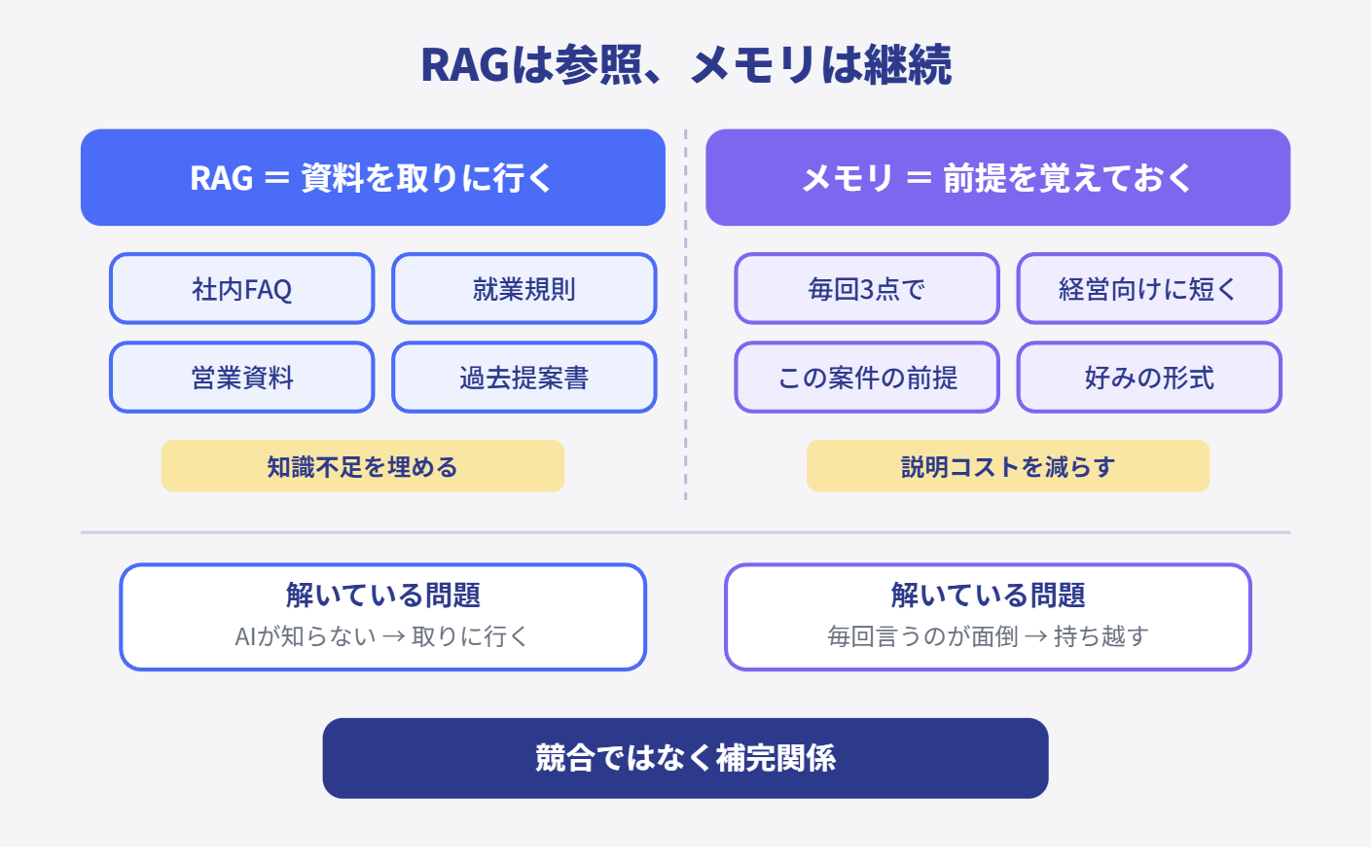 もう少し実務的に言えば、RAGが解いている問題は知識不足、メモリが解いている問題は説明コストです。AIが社内情報を知らないからRAGで取りに行く。毎回同じ好みや形式を伝えるのが重いからメモリで持ち越す。