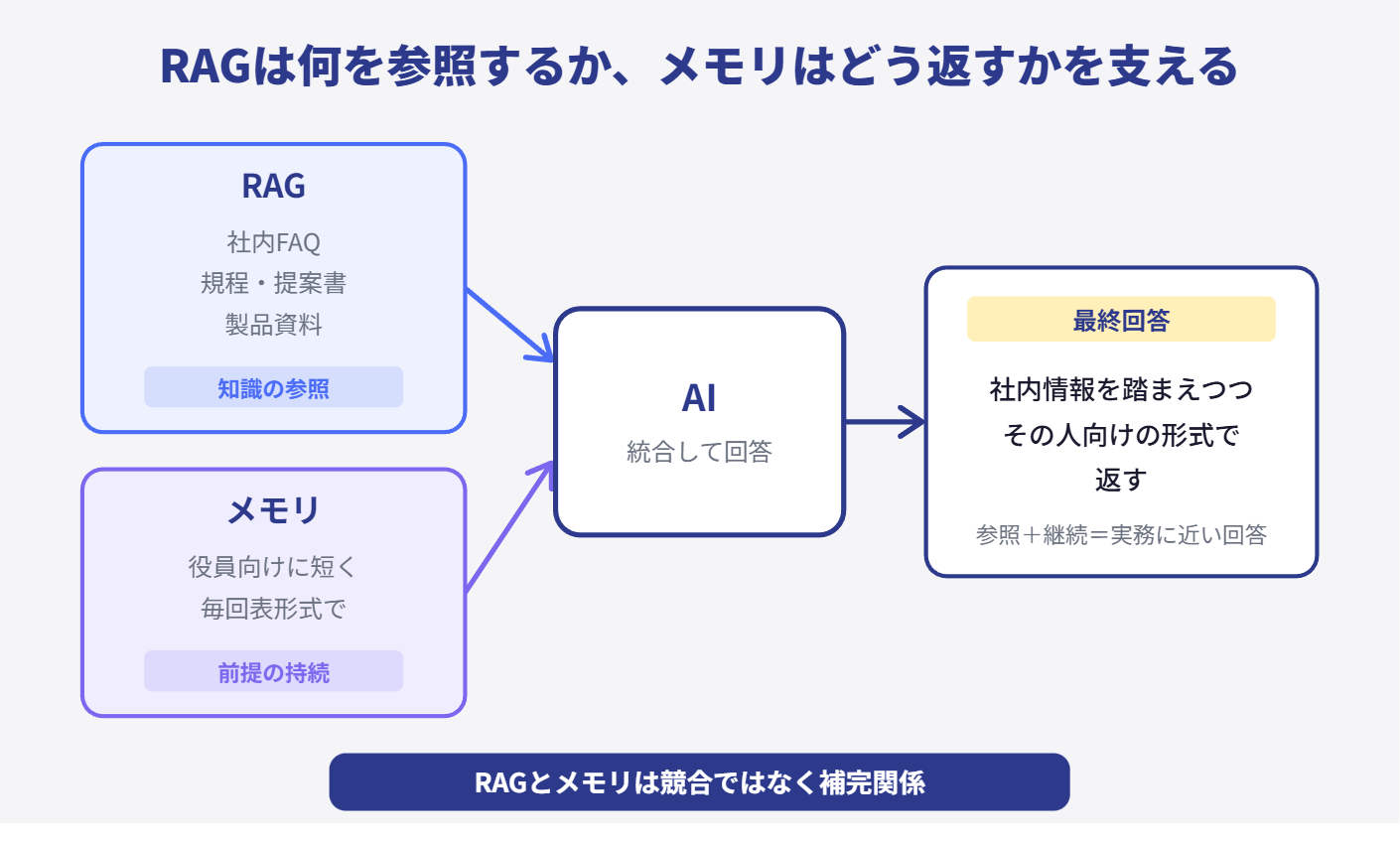 つまり実務では、RAGが「何を参照するか」を支え、メモリが「どう返すかの継続」を支えることが多い。この2つは競合ではなく、補完関係です。